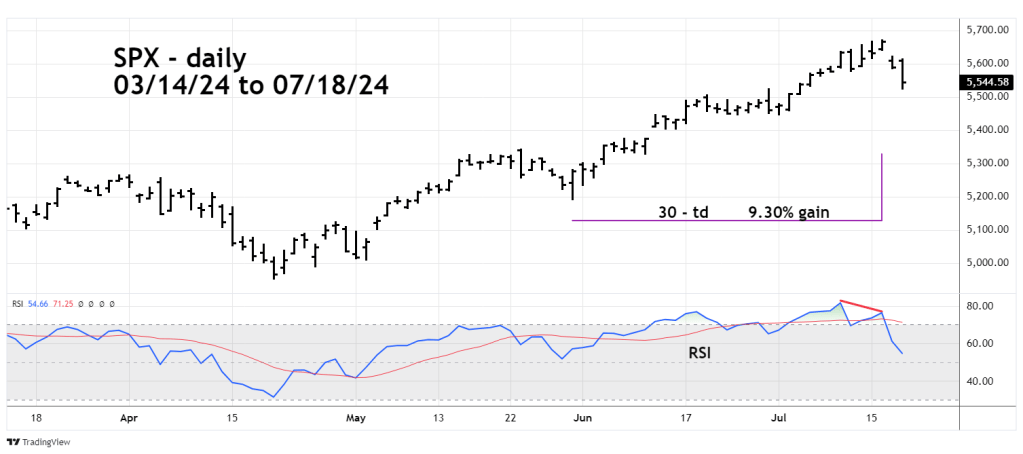 In 30 – trading days the SPX gained 9.30%. The daily RSI reached 81.67 and subsequently had a bearish divergence.
