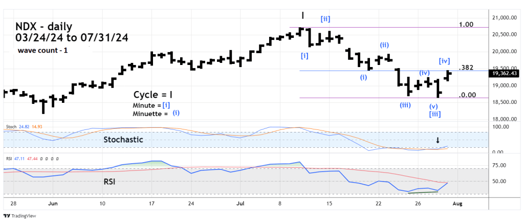 If this count is correct the high on 07/31/24 may have completed Minute wave [iv] of the pattern. On 07/31/24 NDX retraced a Fibonacci .382 of the 07/10/24 to 07/30/24 decline. Wave “fours” typically retrace to the Fibonacci .382 area.