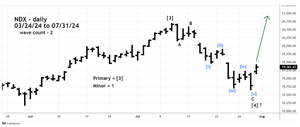 The daily NDX chart courtesy of Trading View shows the first alternate Elliott wave count.