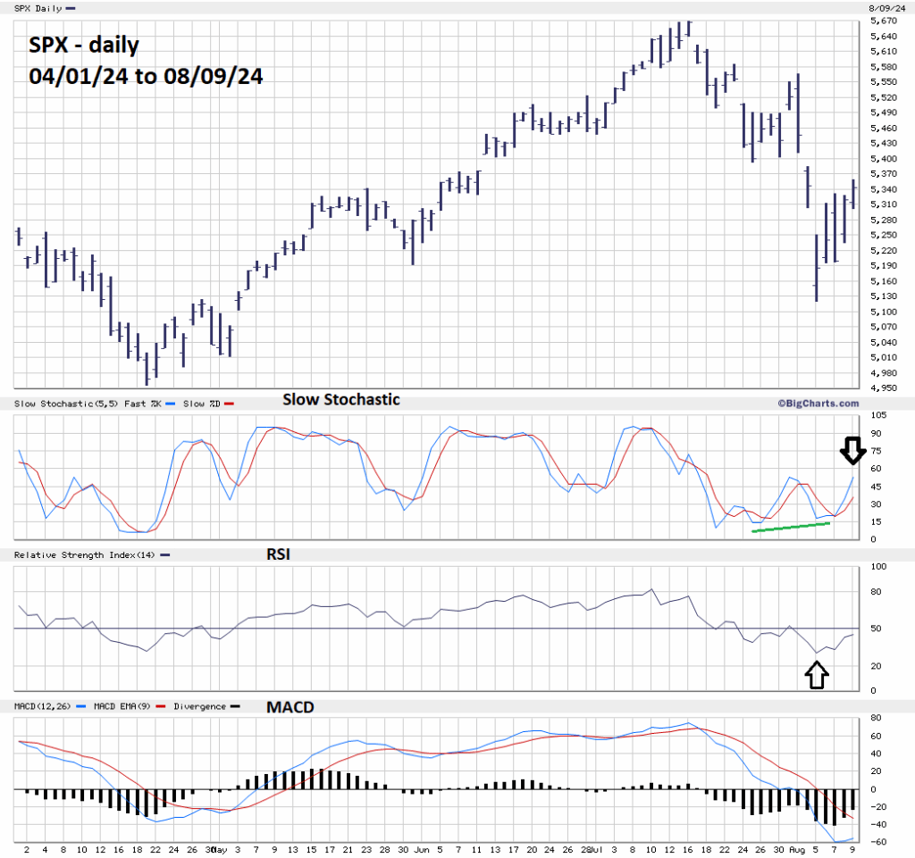 Of course, a top could still be nearby. Please note that the Slow Stochastic reading at the most recent peak made on 08/01/24 were almost at the same level. The difference this time is a more significant Slow Stochastic bullish divergence at the 08/05/24 bottom and the RSI reading of 30.00 – the boundary of its oversold zone.