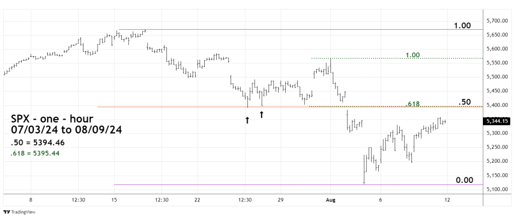 A Fibonacci .618 retracement of the 08/01/24 to 08/05/24 move is at 5,395.44.