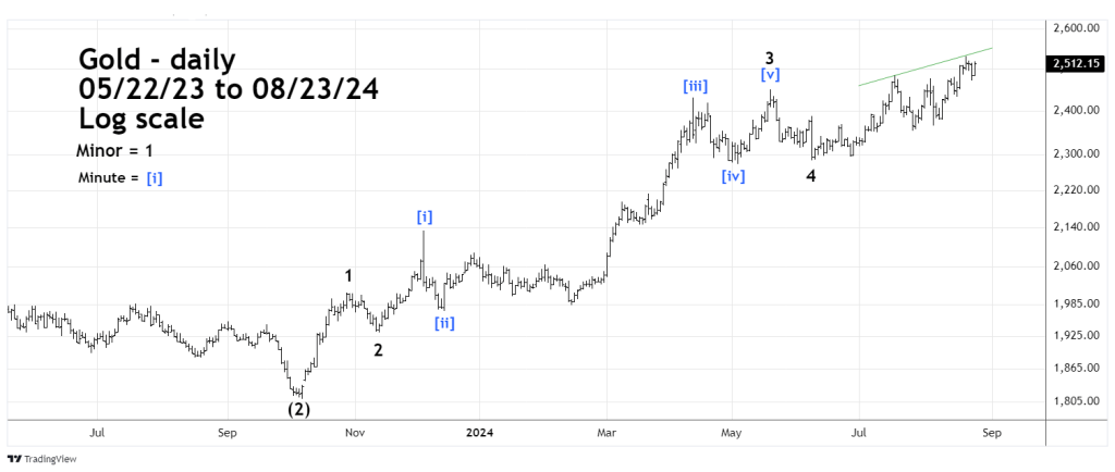 The daily Gold chart focuses on the wave count from the October 2023 bottom.
