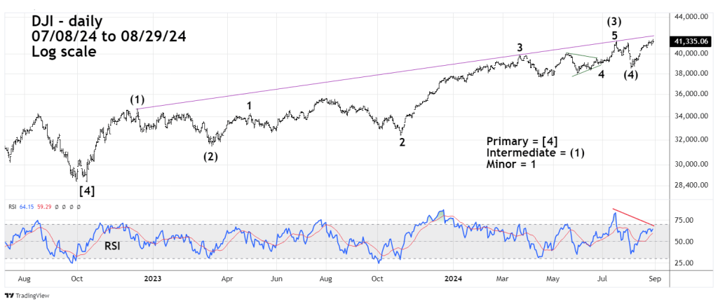 On 08/29/24 the Dow Jones Industrial Average (DJI) made another new all-time high unconfirmed by the S&P 500 and the Nasdaq Composite. The DJI may have also completed an Elliott wave – extended Impulse pattern from the October 2022 bottom.