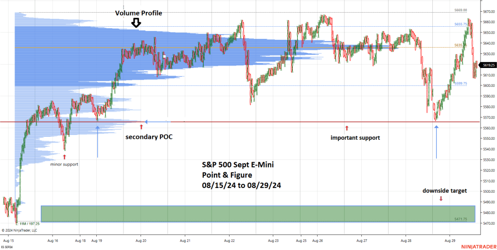 After the main trading session on 08/28/24 – ESU 2024 – Point & Figure chart reached the same level made on 08/19/24. This support level corresponds with a secondary Point of Control (POC) support area. In Volume Profile analysis wide volume zones are potential support/resistance.