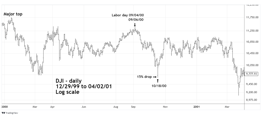 The major top of a massive thirteen-year bull run occurred in mid – January 2000. After a two – month drop, a secondary rally culminated two trading days after Labor Day. Subsequently the DJI declined 15% into mid – October 2000. Later the bear market continued and did not end until October 2002.