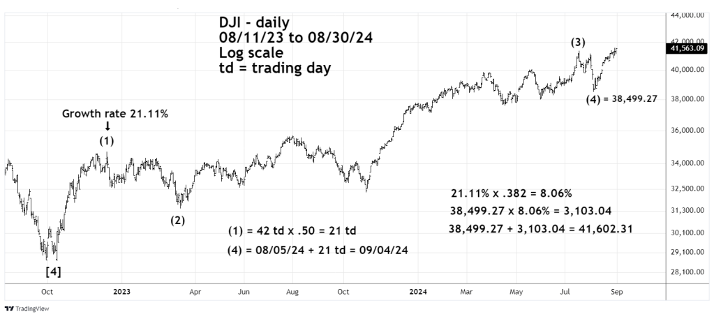 There’s also a potential Fibonacci time relationship. Intermediate wave (1) was 42 – trading days multiplied by the Fibonacci ratio of .50 equal 21 – trading days. Adding 21 – trading days to the Intermediate wave (4) bottom on 08/05/24 targets 09/04/21 for a time cycle turn.