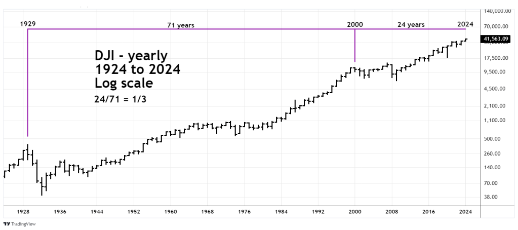 The yearly DJI chart illustrates a Fibonacci time relationship of the two Labor Day peaks.