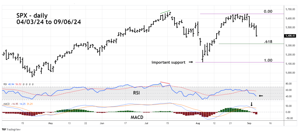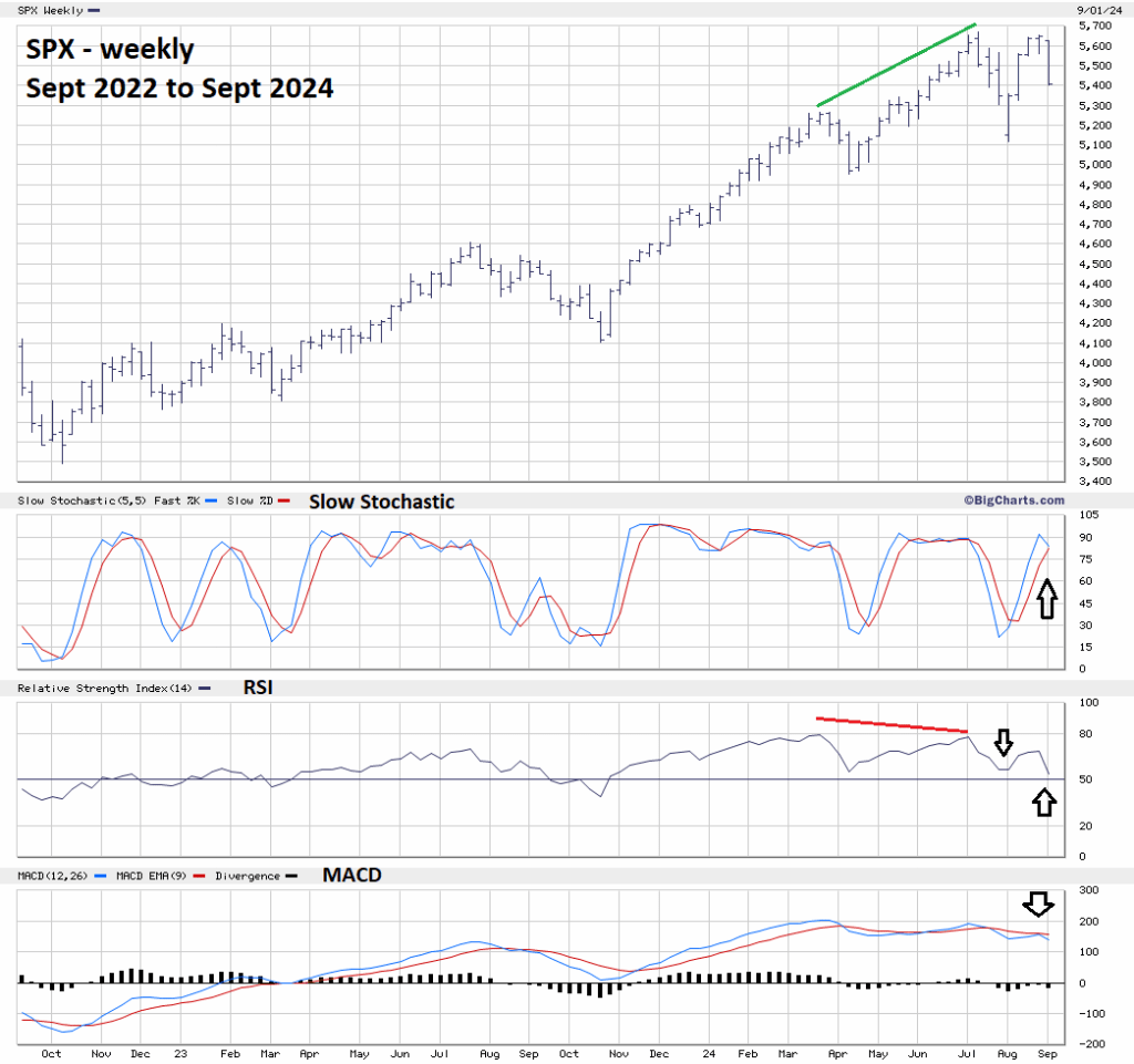 Weekly RSI had a bearish divergence at the SPX July 2024 all-time high. In the first week of September 2024 – RSI went below the reading made in the first week of August 2024. Sometimes this can predict where prices could go. In this case it implies the SPX could go below the bottom made on 08/05/24.
