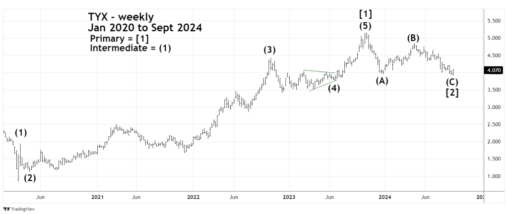 From the major bottom formed in March 2020 to the peak made in October 2023 TYX formed a very clear Elliott extended Impulse wave. The Decline from October 2023 to September 2024 is a clear Elliott wave Single Zigzag correction. In almost all instances of Single Zigzags wave “C” exceeds the termination point of wave “A”. Which in the presumed Single Zigzag from October 2023 to September 2024 has occurred.