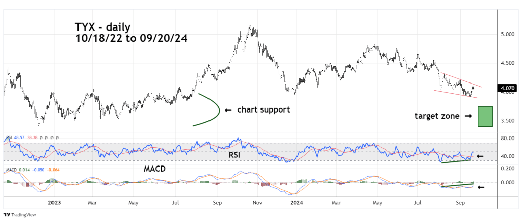 The 09/06/24 blog “U.S. 30 – Year Treasury Yield Update – 09/06/24” illustrated a potential TYX support zone in the area of 3.40 to 3.70. A main factor in determining this zone was the choppy trading range that occurred from late 2022 to June 2023. The September 2024 bottom is in the area of top of the choppy trading range. In particular the peaks made in December 2022. February 2023, and May 2023..