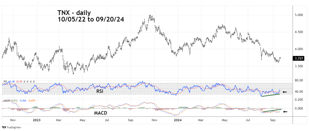 The TNX daily RSI and MACD also have bullish divergences. Both have bullish line crosses.