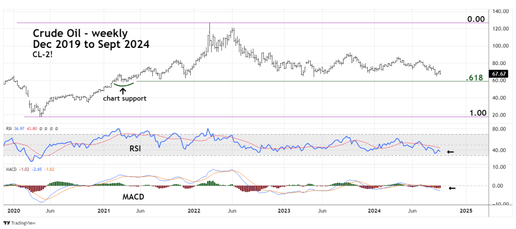 Seasonal patterns and momentum suggests an important bottom could be made between November 2024 to January 2025 in the area of 57.00 to 60.00.