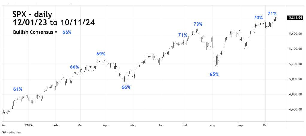 At the most recent reading in early October 2024 there’s a sentiment divergence. Could the Bullish Consensus readings exceed it high of 73%? Anything can happen.