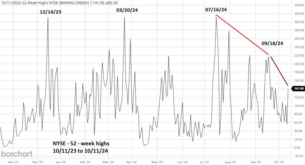 The daily NYSE 52 – week high ($MAHN) chart courtesy of Barchart.com illustrates internal momentum.