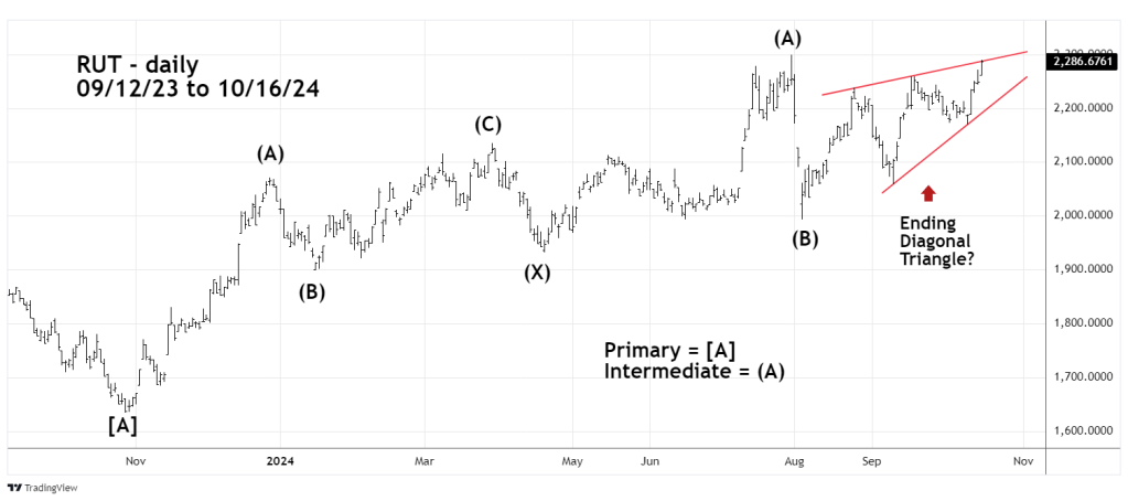 The daily RUT chart shows its prime Elliott wave count since the October 2023 bottom.