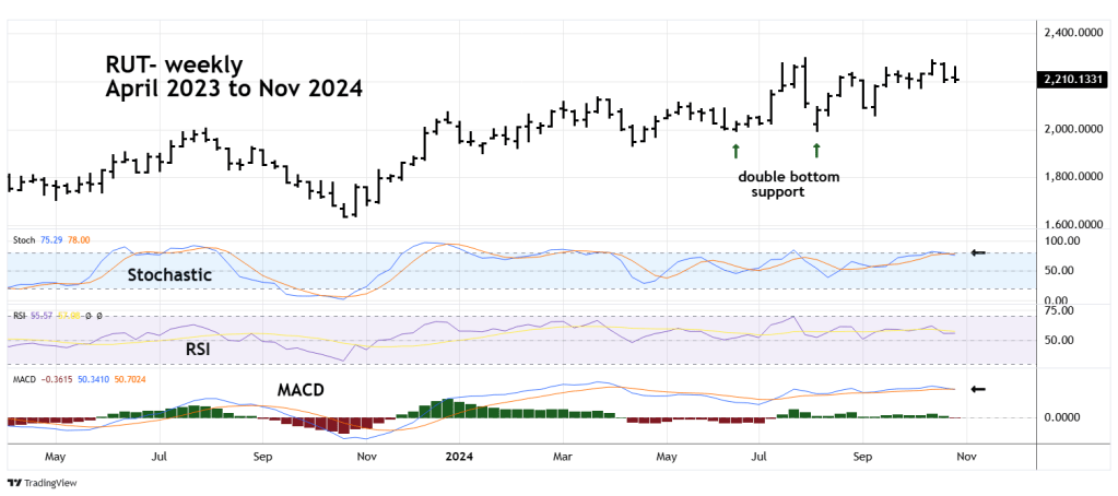 The weekly RUT chart courtesy of Trading View shows the long-term momentum.