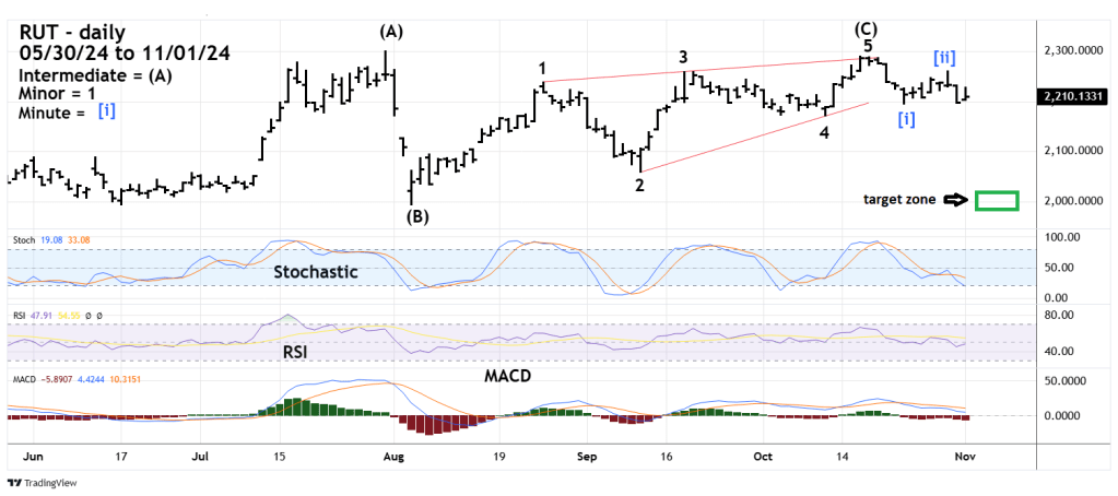 The RUT August to October rally counts best as an Elliott wave – Ending Diagonal Triangle. After completion of this pattern there’s usually a rapid retracement to the triangle point of origin, which in this case is the 08/05/24 bottom.