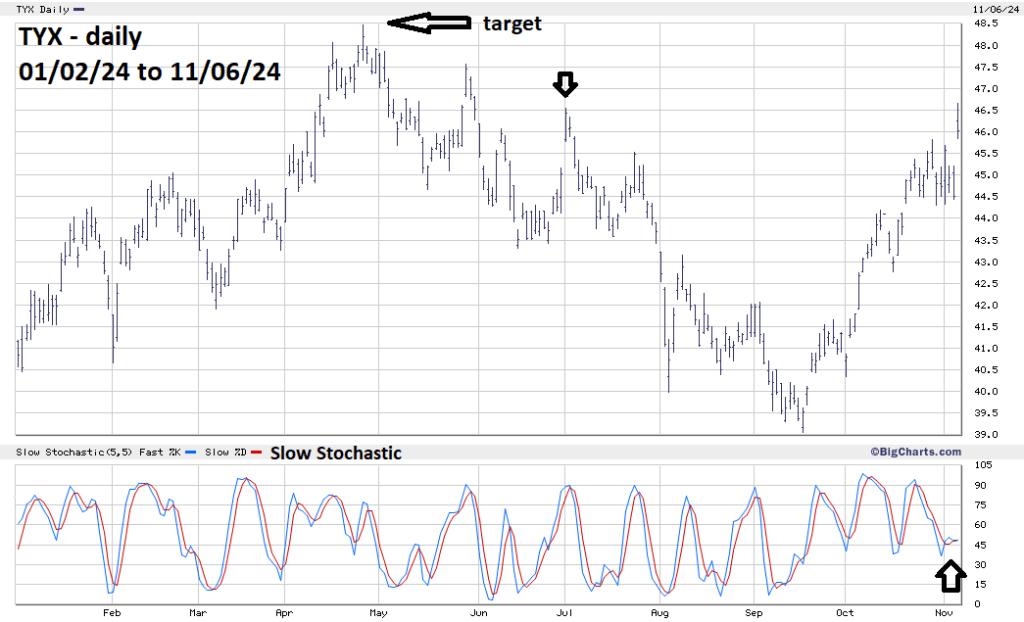 Surprisingly TYX had a big rally that exceeded 07/01/24 peak. This movement with the daily Slow Stochastic bullish lines cross implies TYX could soon reach important resistance at the 04/25/24 top.