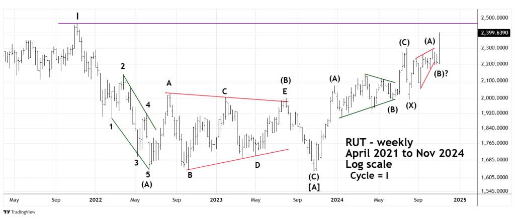 The choppy nature of the RUT rally implies its correcting the downward progress from November 2021 to October 2023 bear market. If so there’s a good chance the entire post October 2023 rally could ultimately be completely retraced.