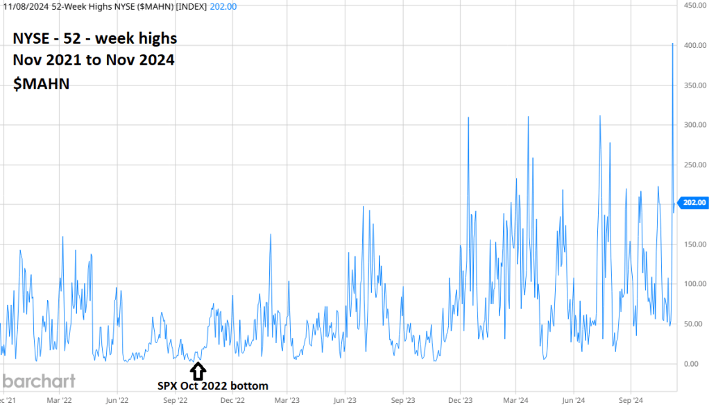 In early October 2024 there was a double bearish divergence for NYSE – highs vs. its mid-July peak. The post U.S. election surge has blow away the divergences to record its highest level in two years!