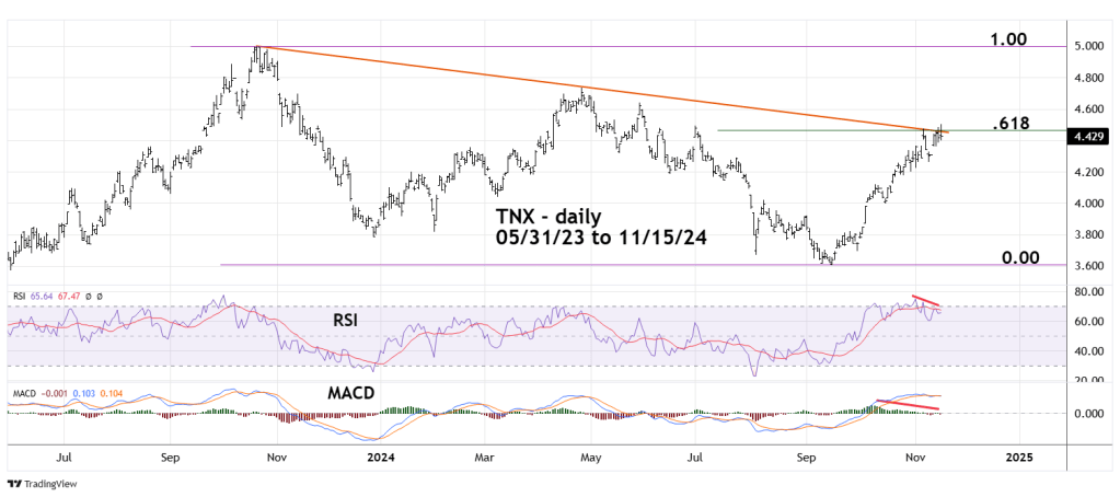 TNX has moved marginally above the Fibonacci .618 retracement level of the October 2023 to September 2024 decline.