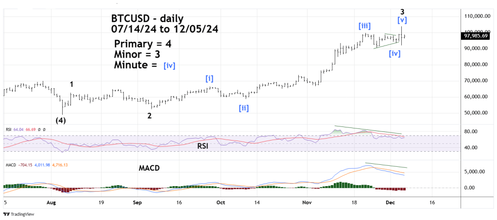 BTCUSD went as high as 104,000 before reaching a peak. This is on the far side of the leeway around 100,000. This factor plus what appears to be an incomplete Elliott wave pattern opens the door for more upside action.