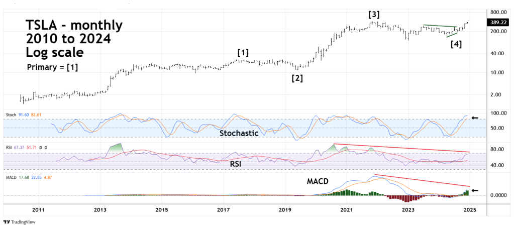 TSLA from November 2021 to August 2024 appears to have completed an Elliott wave – Horizontal Triangle. If so its probably now in a developing Primary wave [5] rally that’s likely to make a new all-time high.