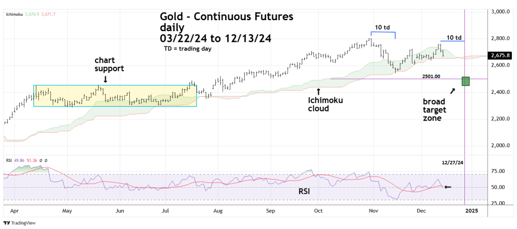 Subtracting 259.70 points from the 12/12/24 peak at 2,761.30 targets 2,501.60 as a bullseye target bottom.