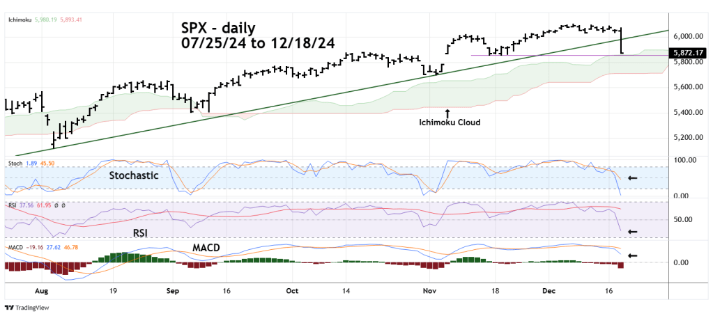 On 12/18/24 after the U.S. – FOMC decision the S&P 500 (SPX) decisively broke below the rising trendline connecting the 08/05/24 and 11/04/24 bottoms.