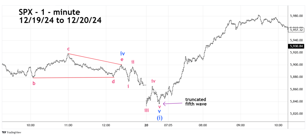 When the fifth wave fails to exceed the termination point of the third wave it’s called a truncated fifth wave. These waves cannot be predicted and are usually discovered well after the fact. This phenomenon occurred between 6:39 AM – ET and 6:50 AM – ET when the decline failed to exceed the SPX opening session bottom. This type of action can be very frustrating to a practitioner of Elliott because of missed opportunities. In this case if you were waiting to go long on a move below the SPX 12/20/24 bottom its probable no action was taken at the higher 6:50 AM – ET bottom.