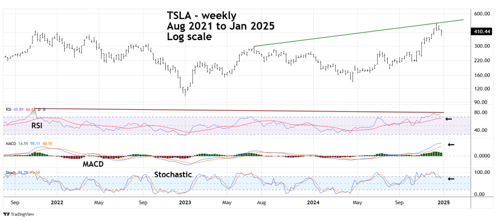 The weekly TSLA chart courtesy of Trading View illustrates its action since 2021.