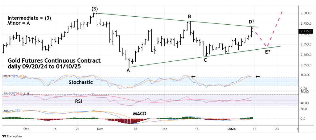 Gold in U.S. dollars since the late October 2024 peak appears to be forming an Elliott wave – Horizontal Triangle.