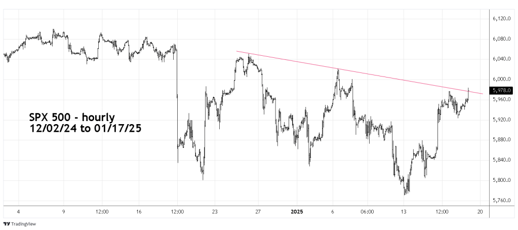 This websites prior blog noted that the S&P 500 (SPX) had powerful resistance in the area of the declining trendline connecting the12/26/24 and 01/06/25 peaks.