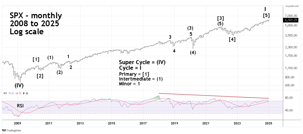 The SPX on 01/24/25 may have completed a Cycle degree Impulse wave that began in March 2009. In Elliott wave theory, subsequent corrections to Impulse patterns are proportional in time and price. The next SPX bear market could continue for several years.