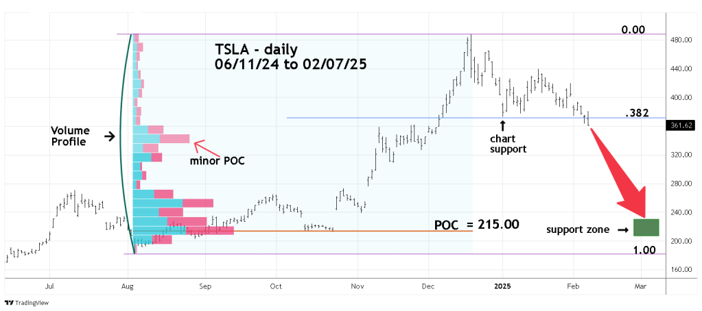 On 02/07/25 TSLA ended the main trading session at 361.62. There’s a minor POC in the 340.00 area. If price can reach this zone it could be temporary support. A break below 340.00 could open the door down to the primary POC near 215.00. Please note this POC corresponds to several days of chart support made in October 2024.