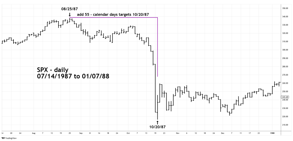 The SPX 1987 bull market peak was on 08/25/87 adding 55 – calendar days targets 10/20/87 which was the day the August to October 1987 ended.