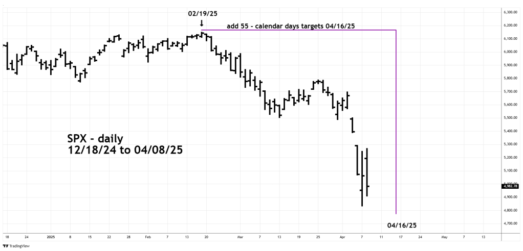 The SPX 2022 to 2025 bull market peak was on 02/19/25 adding 55 – calendar days targets 04/16/25 as a potential 2025 crash bottom.