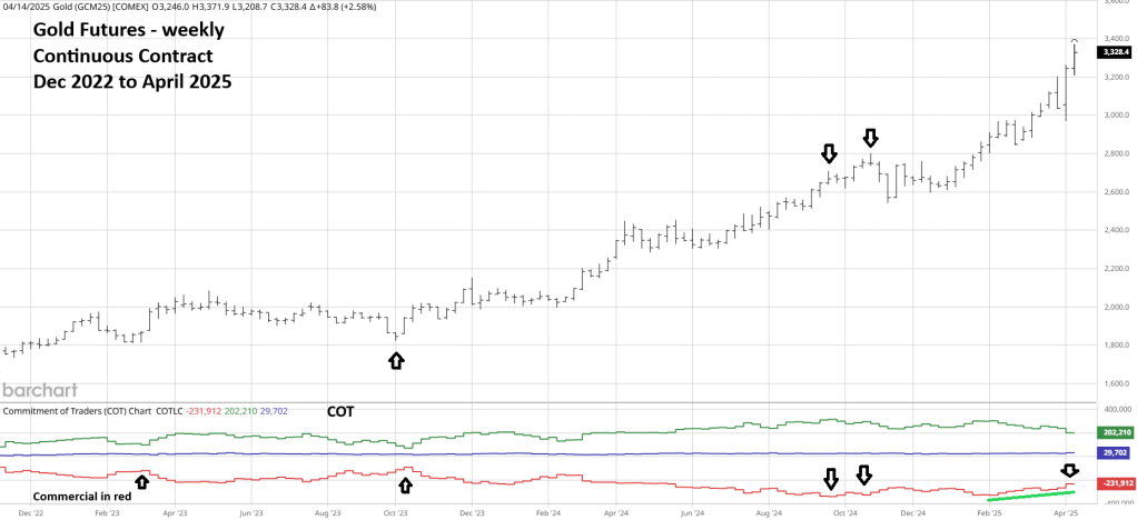 The fascinating aspect of the 2025 Gold rally is that Commercials have been decreasing their net short positions! If there is a near – term peak for Gold, the Commercials anticipate higher prices later in 2025.