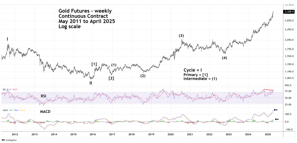 The weekly Gold Futures (GC1!) chart courtesy of Trading View updates the long-term Elliott wave count.