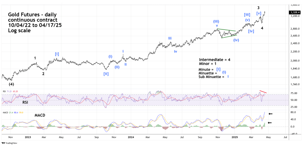 Gold currently appears to be in Intermediate wave (5) of Primary wave [3]. Weekly RSI has a bearish divergence while MACD – lines and Histogram are at the highest levels since the bull move began in October 2022. Usually at significant price peaks both RSI and MACD have bearish divergences. The current mixed signals imply Gold could be in the process of forming only a short-term peak.