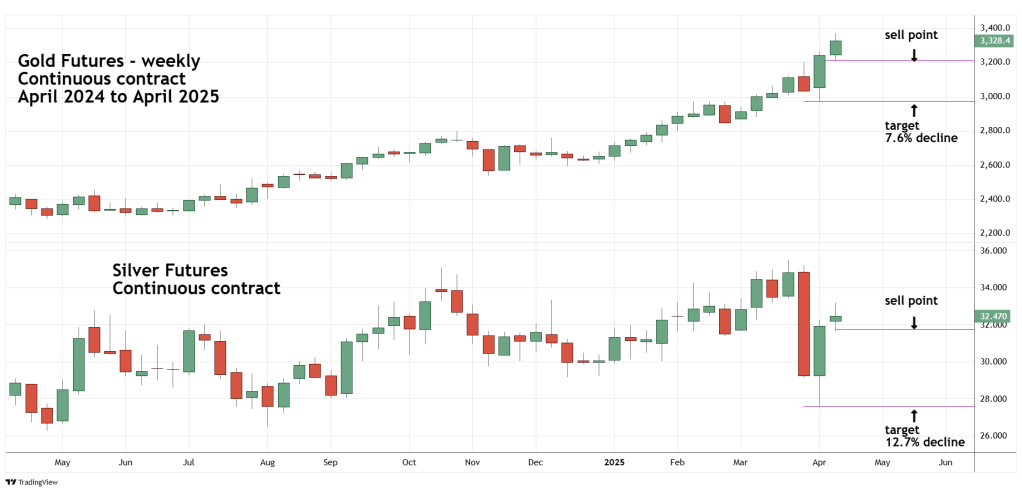 The 04/19/25 blog “Near-Term Gold Opportunity – 04/17/25” Ilustrated a strategy to potentially profit from a near – term drop in Gold. The conditions for Silver are the same, the profit opportunity could be greater.