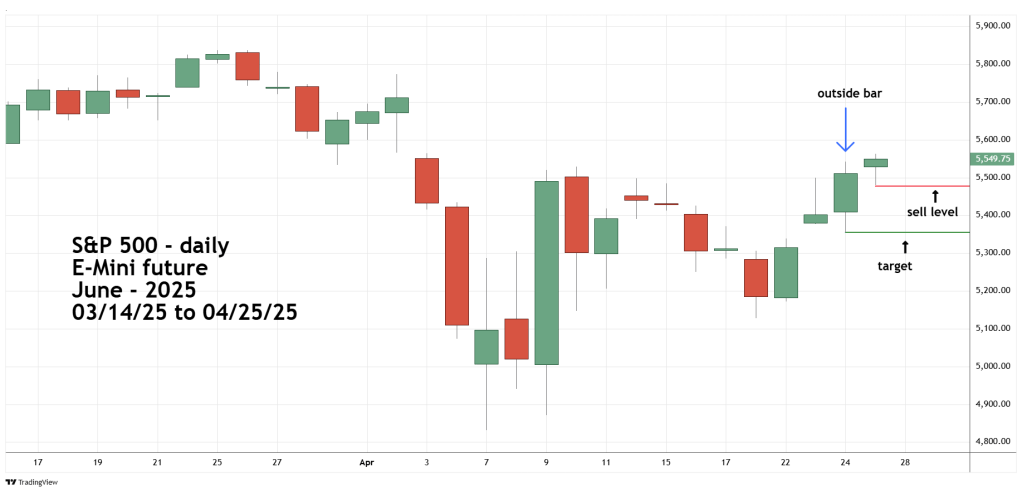 The daily S&P 500 – June 2025 – E-mini futures chart (ESM2025) examines what could happen on 04/28/25.