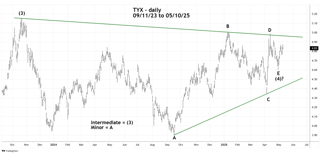 The weekly TYX chart illustrates where the Horizontal Triangle could fit in with the larger Elliott wave structure.