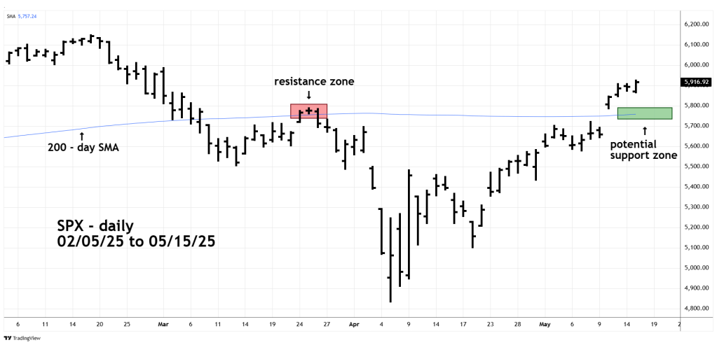 Any short-term decline is likely to find support at or near the 200 – day SMA. Please note how the line proved to be resistant after the SPX decisive break below the line in early March.