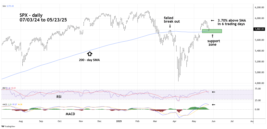 In late March 2025 the SPX rallied marginally above the 200 – day SMA. Bears defended the line; the SPX subsequently declined16% below the SMA. The SPX mid – May 3.7% move above the 200 – day SMA could be decisive. It’s possible the bulls will use the current move back to the area around the 200 – day SMA as a reason to buy.