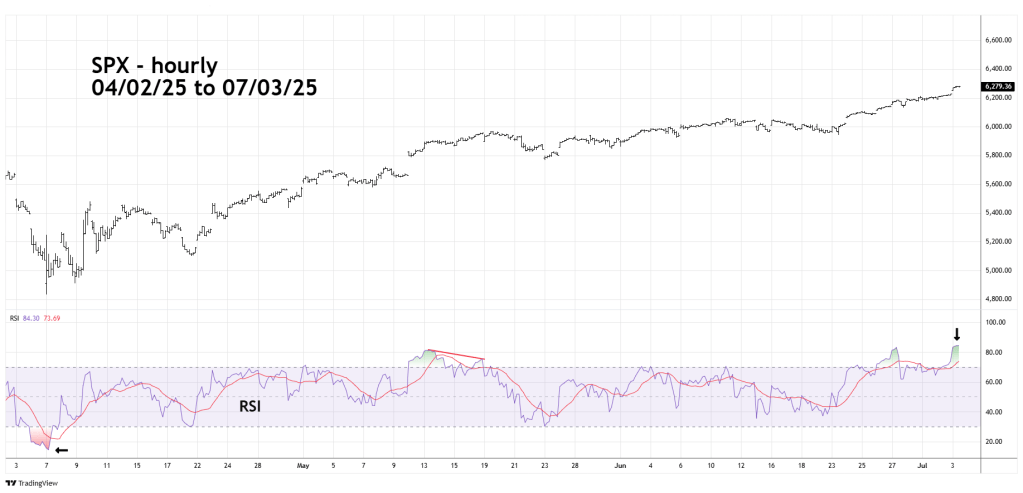 Hourly SPX – RSI has again made another post 04/07/25 rally high. On 07/03/25 hourly RSI reached 84.30 deep in the overbought zone. This is the highest hourly reading since 08/19/24 when it reached 87.30. Usually, stock indices could turn when there’s at least one RSI divergence. There are of course exceptions. Please note the SPX 04/07/25 bottom corresponded with a maximum RSI downside reading.