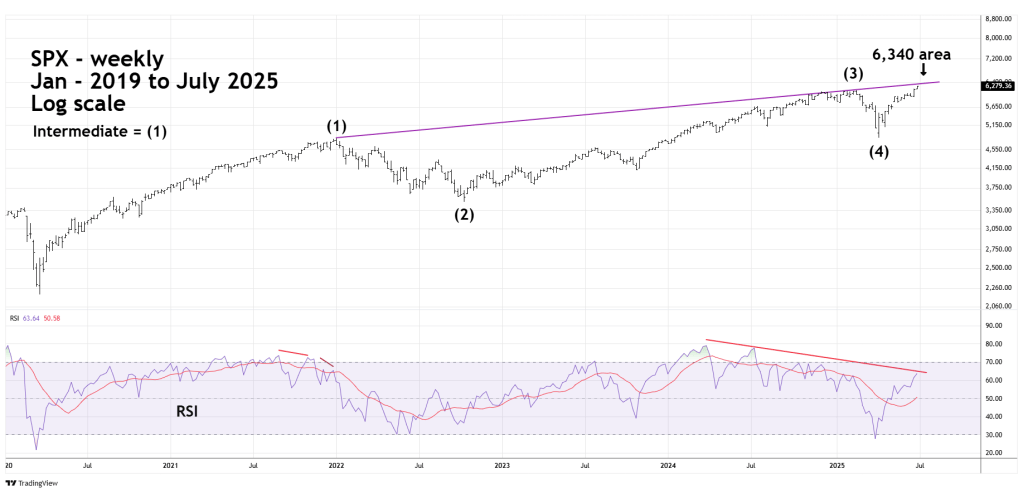 The SPX is nearing the long-term rising trendline connecting the January 2022 and February 2025 peaks, which is around the 6,340 area. This zone could be reached in the next one or two weeks. Please note the weekly RSI significant bearish divergences.