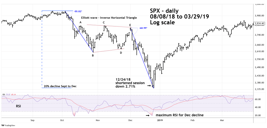 From September to December 2018 the SPX declined 20%. The drop was in three waves with middle wave taking the form of an Elliott wave – Inverse Horizontal Triangle.