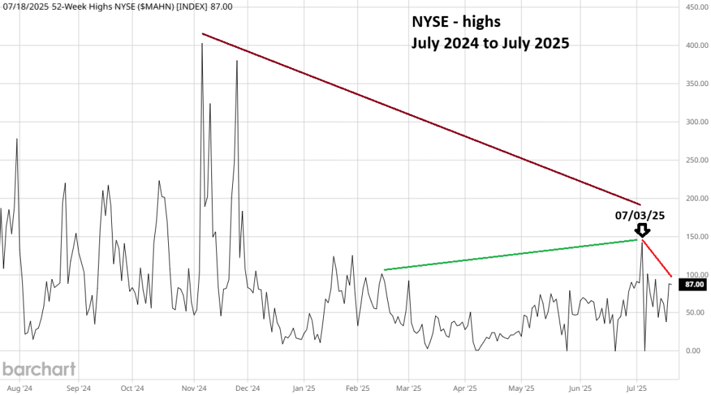 On 07/03/25 the S&P 500 (SPX) made a new all-time high. At the same time NYSE – 52 – week highs surged above their peak made in mid – February 2025. The SPX prior all-time high was in mid – February. The 07/03/25 surge in new highs implied more upside price action. However, note the massive bearish divergence vs. the readings in November 2024.