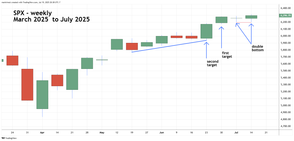 The SPX bottoms at 6,201.00 and 6,201.59 are separated by more than six – trading days, implying a break below could continue for six trading days or perhaps several weeks.